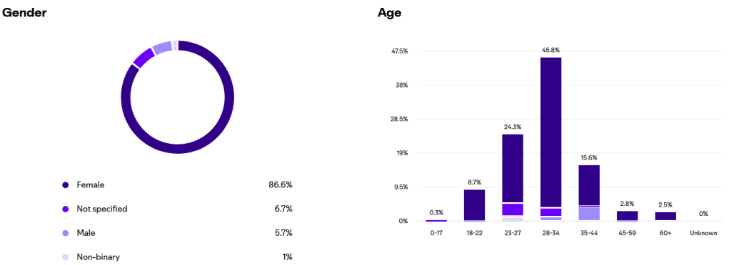 Next is my favorite thing, analytics! Let’s dive in. Over the whole past year, our audience has been 86.6% female (who could have seen this coming?) and nearly half our listeners are between 28 and 34 years old. If you look at the last 30 days alone, that number is even higher. We definitely have a target demo.