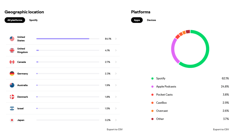 Where are these listeners, geographically and virtually? Again, predictably 84% of our total listens are coming from the US. We’re three Americans doing a podcast about an American book – that’s just gonna happen. But I would love to see more international listeners in the future! Of our top 5 countries, 4 are English speaking ones of course. But welcome in, Deustchland! Spotify is our biggest platform with 62% of listeners, followed by Apple Podcasts at 24% and then the true GOAT Pocket Casts trailing in 3rd. This is an earnest recommendation to use Pocket Casts!