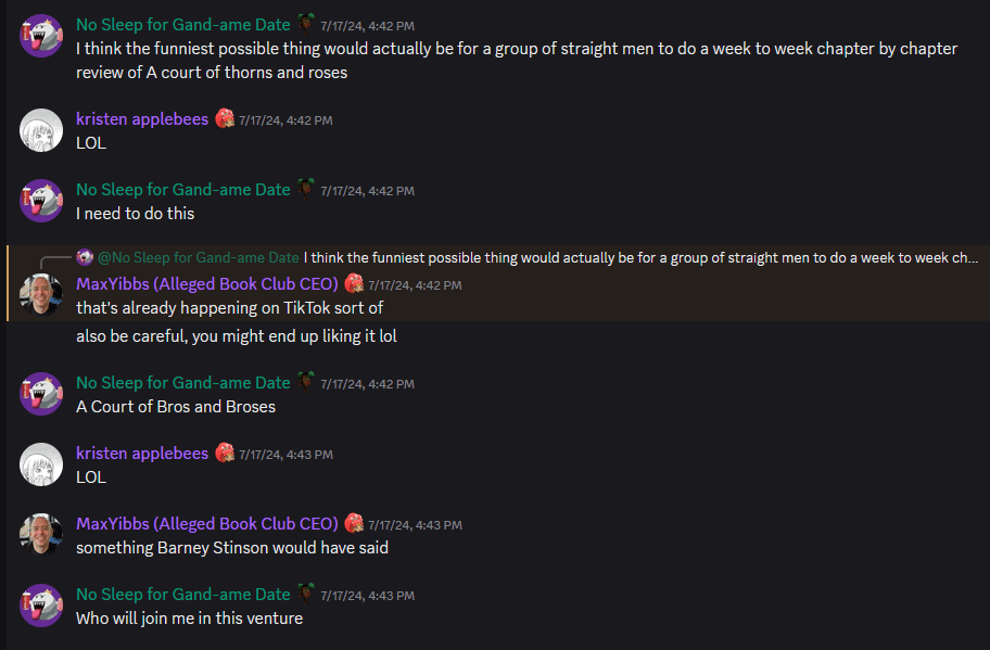 So first, let me do my thanks. To Joe and Patrick, thank you for being incredible friends and podcast co-hosts, and frankly we figured out our dynamic and on-air personality back and forths faster than any podcast I’ve listened to. A bro is nothing without broses. A thank you to Rachel for organizational support on the Discord and Tiktok/Instagram, and to Alexa for re-reading all these books to let us know what chapters should be done in what episode chunks, and to the love of my life Lyndsey for forcing me against me will to really, truly believe in and love myself.